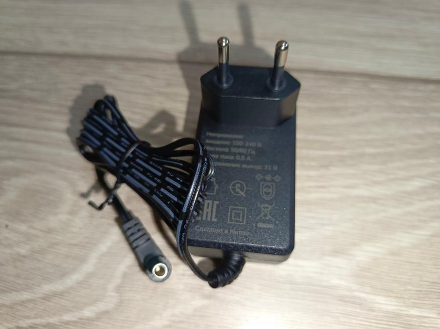 Комплектный блок питания с выходным напряжением 31 В и силой тока 0,5 А, что в совокупности дают выходную мощность 15,5 Вт. Длина проводов около одного метра. Аккумулятор съемный, и его можно заряжать через пылесос, при условии, если устанавливаете его на подставку или через разъем на самом АКБ.