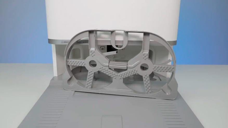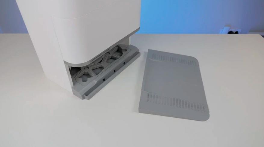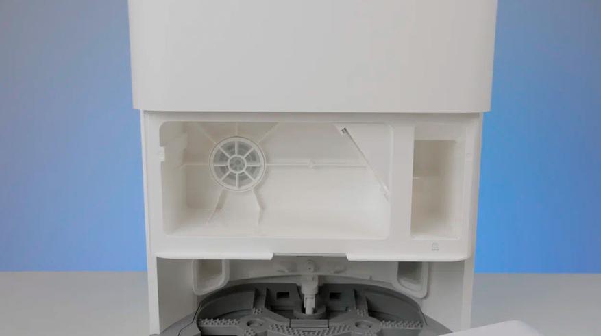 Док-станция со стандартными габаритами 457 х 340 х 588 мм. Компоновка тоже привычная: вода из резервуаров вверху поступает в поддон, где робот промывает салфетки в горячей воде, а затем насосы откачивают отработанную жидкость обратно. Дозатора моющего средства нет, зато есть скребки для самоочистки поддона.