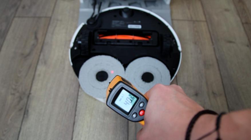 Промывка мопиков занимает 3 минуты с комфортным уровнем шума в диапазоне 50-60 дБ. Температура подогрева рекордная — тепловизор зафиксировал 64,8*С! Даже у более дорогих All-in-One от Dreame и Roborock нет таких показателей (речь о фактических значения на тепловизоре!). Расход воды умеренный — всего 200 мл на одно промывание.