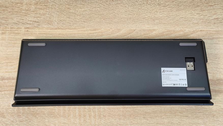 На дне данной клавиатуры ничего необычного или нового нет, привычные наклейки, силиконовые упоры, ножки выдвижные. Поэтому, не буду задерживаться здесь.