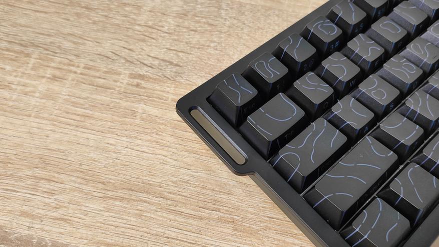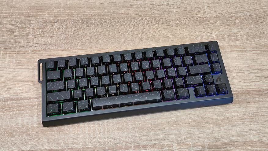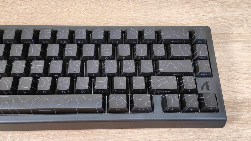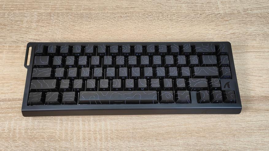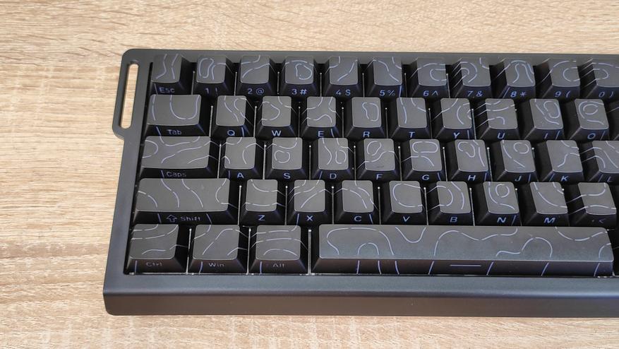 У клавиатуры пластиковый корпус. С какой-то стороны, если взглянуть на клавиатуру, то ничего необычного в ней нет, разве что ушко для присоединения ремешка. Всё дело в колпачках и рисунках, которые в них используются. Есть множество похожих вариантов, но конкретно такой, называется топографический, например, для обозначения разных высот. Впервые, когда я увидел подобный вариант с подсветкой, было двойственное ощущение, во-первых, будто непонятно что изображено, во-вторых, рисунок был слегка завораживающим. В любом случае эта заслуга целиком и полностью колпачков так как корпус монолитный и выполнен из одноцветного пластика.