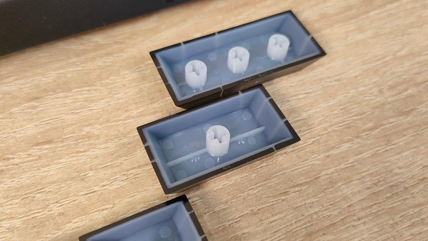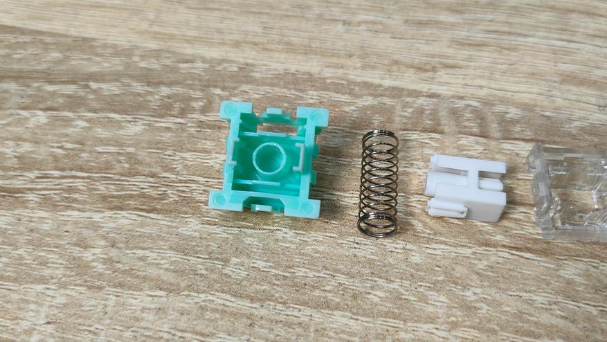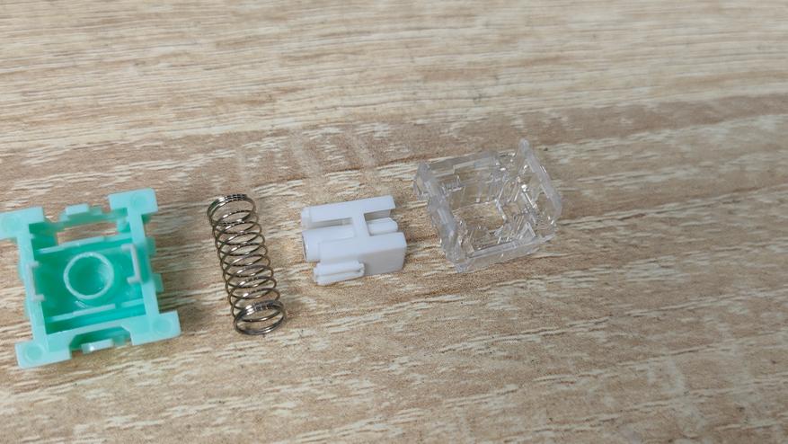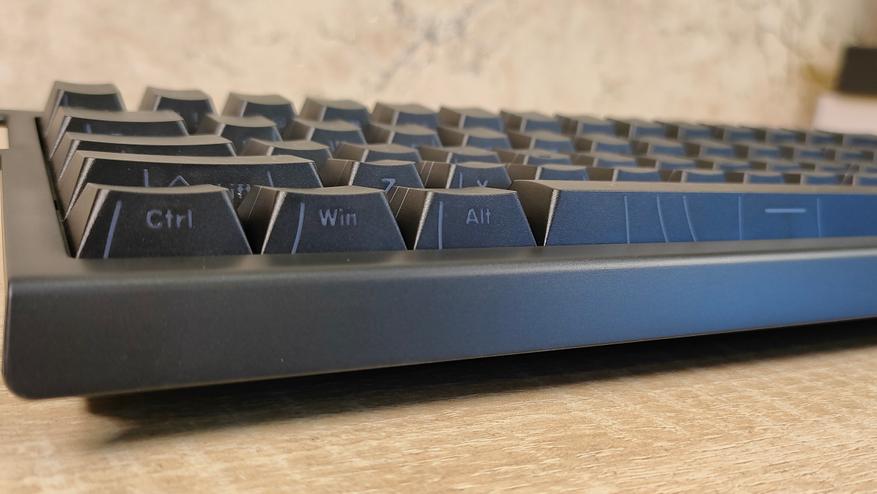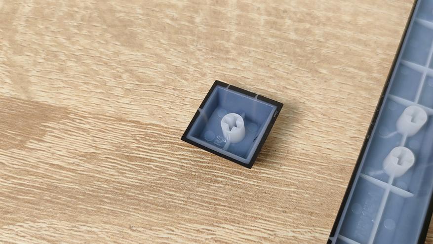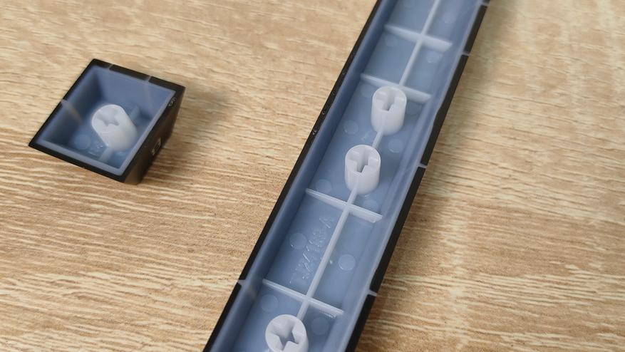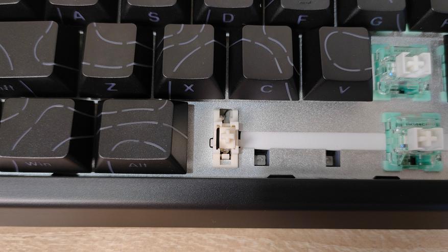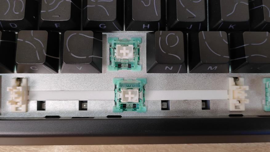 Обозначение материала колпачков в разных источниках разное, по одной версии это PBT пластик, по другой версии не указывается вообще, будто избегают. Чистый PBT вряд ли возможен, так как все контуры подсвечиваются, а значит, должны быть из материала, который просвечивается, например, ABS. Либо, здесь целиком и полностью двойное литьё из ABS пластика. Но в других клавиатурах с таким типом рисунка на колпачках, тоже встречал, что материал PBT, так что выведу такое умозаключение, что всё-таки используется комбинация PBT плюс ABS, основанное только лишь на моем предположении. В любом случае, выглядит неплохо и свежо. Толщина стенки примерно 1,5 мм, это также является неким стандартом для типичных PBT колпачков, что тоже отправляется в копилку голосов именно за этот материал. Кириллицы на клавиатуре нет, и когда были первые макеты, я очень топил за то, чтобы на данной расцветке, если можно её так назвать, не было гравировки, так как она очень сильно испортила бы внешний вид и клавиатура потеряла свой шарм. Да, скорее всего, это оттолкнёт часть пользователей, которые без кириллицы не пишут/печатают, но она также приобретёт своих пользователей, которым больше понравится целостный внешний вид. Тут, в общем, давняя борьба, сил разума с силами добра, ну, или вкусовщина. Стабилизаторы установлены в пластину позиционирования, обильно смазаны, и без каких-либо сюрпризов, в этом плане здесь всё стабильно.