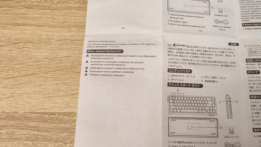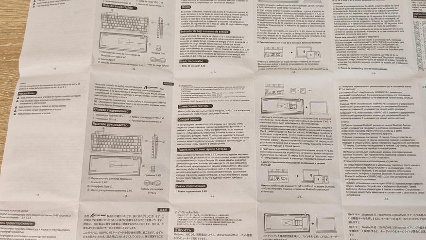 Кроме качества самой коробки, на ней достаточно информации об устройстве внутри: внешний вид, основные характеристики, а также различные фишки, например, частоту 8 КГц (в проводном режиме), которые встречаются в этой клавиатуре. Комплект поставки следующий: клавиатура, крышка-пыльник, ремешок, кабель для подключения, пара переключателей, руководство пользователя.