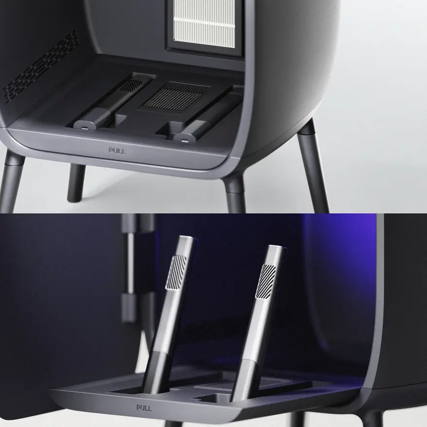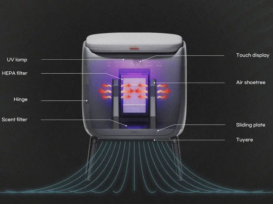 Система фильтрации включает HEPA-фильтр для очистки воздуха и ароматический фильтр для устранения неприятных запахов. В верхней части камеры установлена ультрафиолетовая лампа, предназначенная для уничтожения бактерий на поверхности обуви.