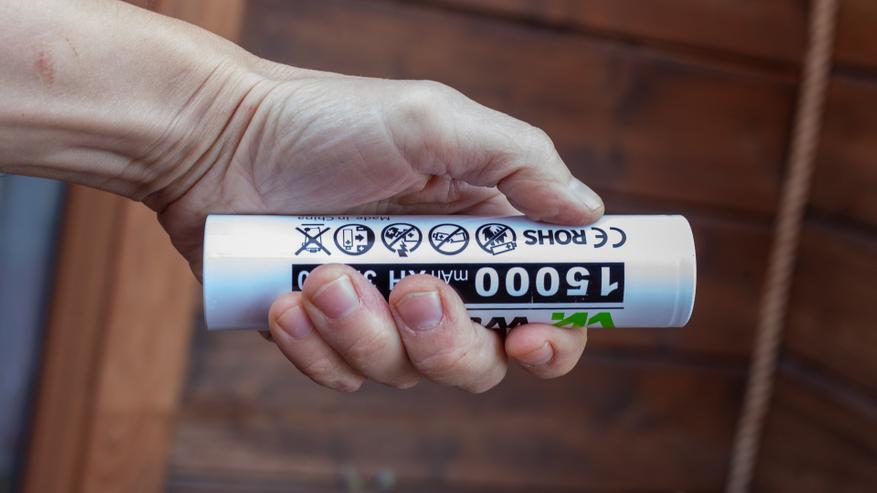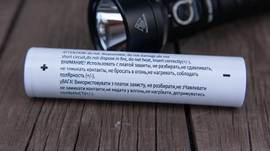Ёмкость. Такой колоссальный размер, разумеется, означает и колоссальную ёмкость, тут она 15000mah. Казалось бы, ого, один аккумулятор имеет ёмкость трех 21700 по 5000mah… но нет, тут есть нюанс. Аккумулятор этот не привычный для фонариков Li-Ion, а литий-железо-фосфатный, то есть LiFePo4. И ёмкость тут указана для напряжения в 3.2В, а не 3.7. Соответственно, переведя в Ватт*часы имеем 48Вт*ч, а не 55,5 Вт*ч. Как бы да, хитрецы, указали меньше — но даже так это очень, очень высокая ёмкость!