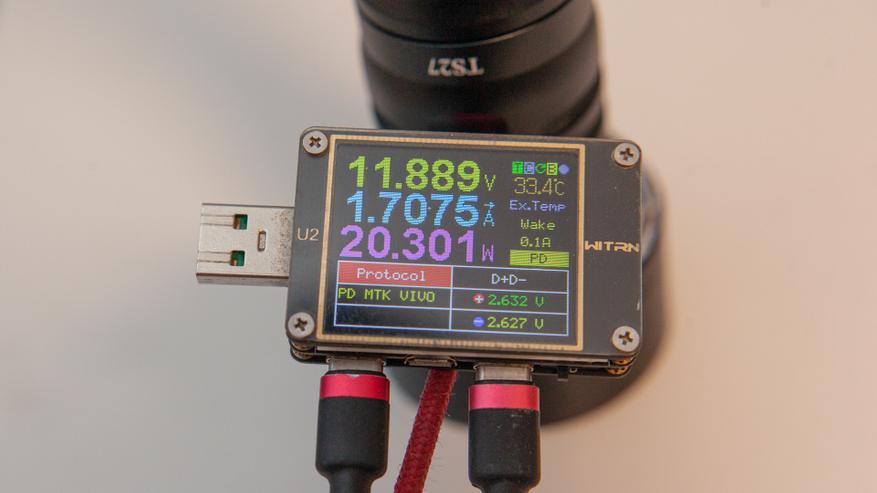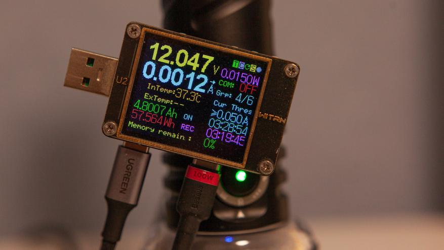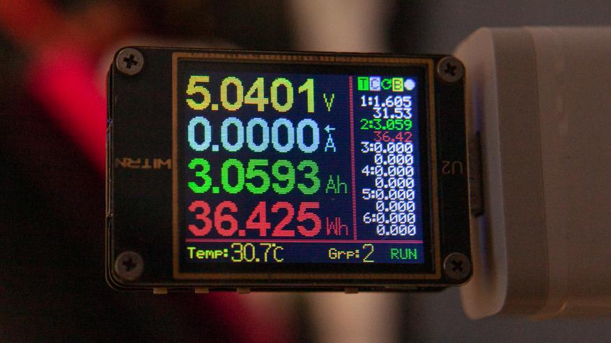 Тут ток небольшой 1.5А, но это не повод огорчаться — такой ток идёт при напряжении в 12В. Итоговые 18Вт на зарядку — мощность достаточная, чтобы даже этот колоссальный аккумулятор заряжался за три с небольшим часа (по тестеру влилось 57.5Вт*ч). Wurkkos TS27, к слову, работает и как повербанк. И я смог получить с него максимум 20Вт мощности. В режиме повербанка аккумулятор отдал 36.45Вт*ч. А это ёмкость обычного 10000mah аккумулятора.