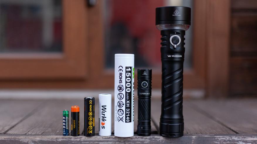 Это самый большой аккумулятор, о котором я слышал вообще. Формат аккумулятора 32140 означает диаметр в 32мм и 140мм длины! Этот аккумулятор сам по себе тяжелее и больше множества обычных карманных фонариков, смотрите на фото. Для примера я подобрал набор всех популярных аккумуляторов и добавил компактный дальнобойный фонарик Sofirn SR12. И чтобы не возвращаться второй раз к этой теме, давайте сразу расскажу две важные вещи про аккумулятор Wurkkos TS27.