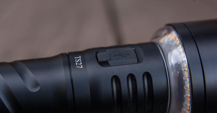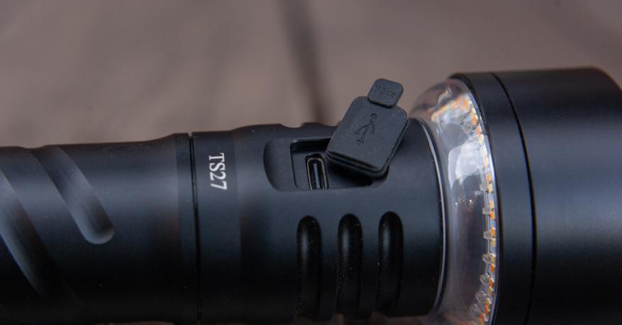 На обратной стороне, как обычно, находится USB-C разъём зарядки. Заглушка толстая и к нему подходят разные кабели (бывает что для некоторых разъём оказывается слишком узким). 15000mah — ёмкость огромная и по-хорошему мощность зарядки должна её соответствовать, чтобы фонарик не пришлось заряжать всё ночь. Помню времена, когда стандартом был micro-usb и 0.5А — заряжать приходилось очень долго, очень. Сейчас же, благо, фонарики в массе вполне тянут и 2А.