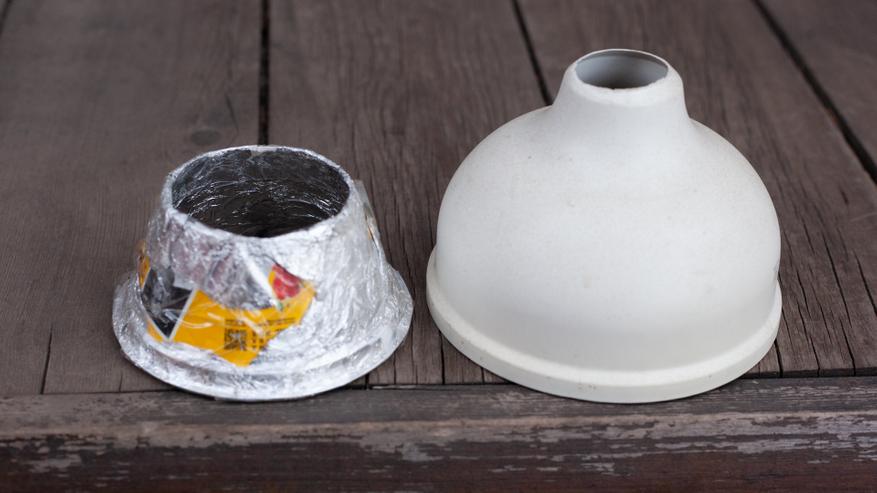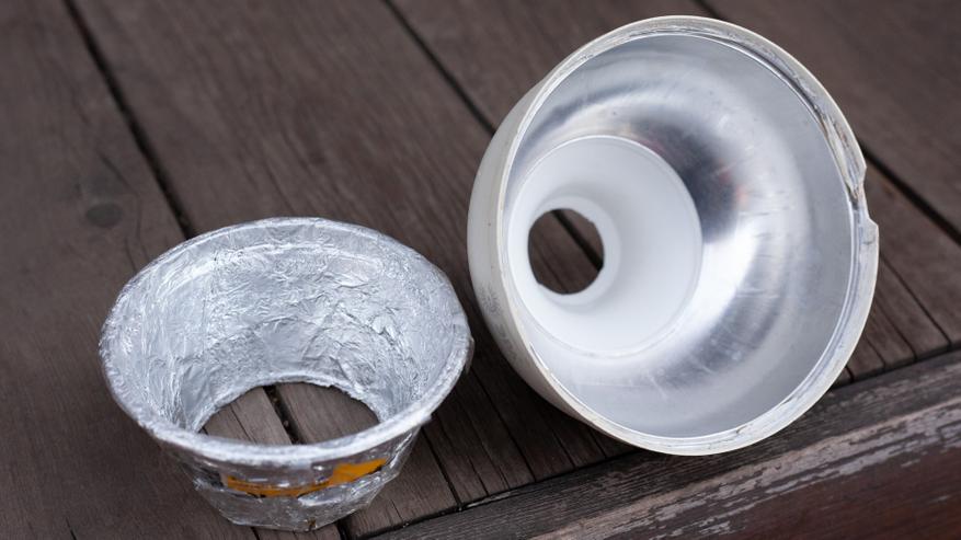 И коли поднялась тема колхоза, то не могу не напомнить о самодельных плафонах. Обычно настольные кемпинговые фонари, те самые «бочонки» светят по бокам, что и логично. Это не особо-то удобно — такой свет и изрядно бесполезно рассеивается вбок, попутно еще и слепя сидящих за столом. В этом плане висящие под потолком и светящие вниз «блюдца» определённо гораздо предпочтительнее стоящих на столе «бочонков». Из-за своей длинной ножки и особенности расположения светодиодного кольца Wurkkos TS27 светит скорее вниз, чем вбок. Но можно попробовать вообще отсечь весь уходящий вбок свет. И для этого нужно сколхозить плафон-отражатель!