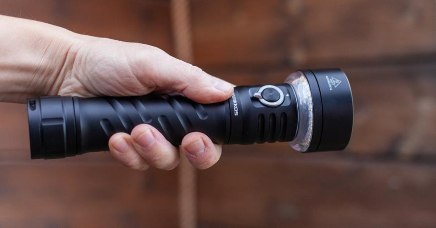 И отлично что у фонарика такая широкая ручка, ведь одна из его фишек — кемпинговый свет, то самое прозрачное кольцо под головой. Соответственно, подразумевается, что фонарик будет стоять на столе. И при 21.7см длины, важно чтобы он стоял надёжно. Широкая ручка (точнее даже ещё более широкая хвостокрышка) и тяжелый аккумулятор в нижней части фонарик, разумеется, повышают устойчивость.