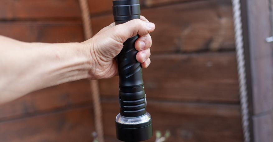 Ну, а теперь время посмотреть на фонарик поближе. Видим формат «дубинки» привычный по множеству поисковых и особенно дайвинговых фонариков, среди которых немало используют питание от двух 26650 аккумуляторов. Собственно, если поставить пару 26650 друг на друга, то и получим этот 32140. Разница будет лишь в 6мм диаметра и 10мм длины. В руке фонарик сидит удобно, развесовка хорошая. Глубокая накатка даёт надёжный хват, но в силу веса и размера темляк всё равно будет не лишний.