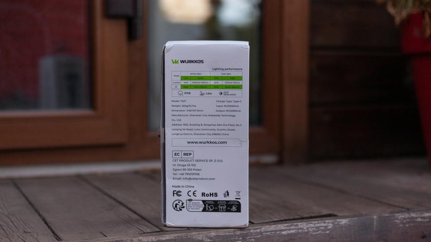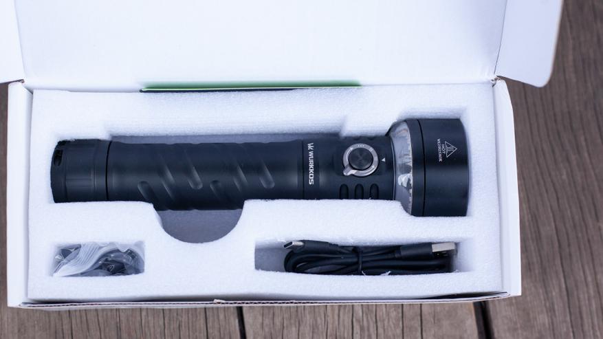 Всё, что может подсказать, что внутри находится необычный фонарик — это размер упаковки. В остальном это привычная едва ли не всем фонарикам Wurkkos белая картонная коробка с изображением самого фонарика спереди и основными его характеристиками и таблицей со временем работы на задней стороне. Разница, пожалуй что, только в одном — тут нет суперобложки и магнитного замка, изображение напечатано прямо на коробке.