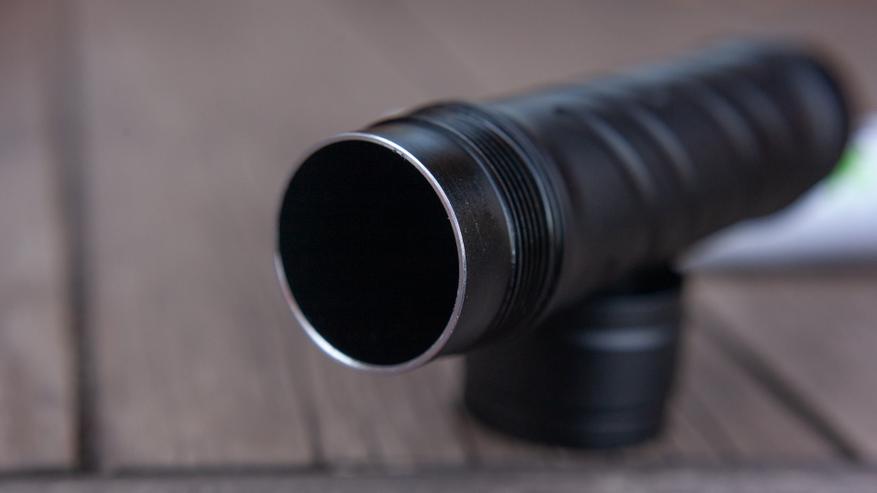 Фонарик разбирается на три части. Установить трубку обратной стороной нельзя. Тут и резьба не совпадёт по количеству витков, да и обращённая к голове часть не просто так имеет округлую широкое контактное кольцо — ей соответствует такое же в голове фонарика. Да и, впрочем, устанавливать трубку обратной стороной имеет смысл, если хочется сменить положение клипсы. А её-то тут, разумеется, нет!
