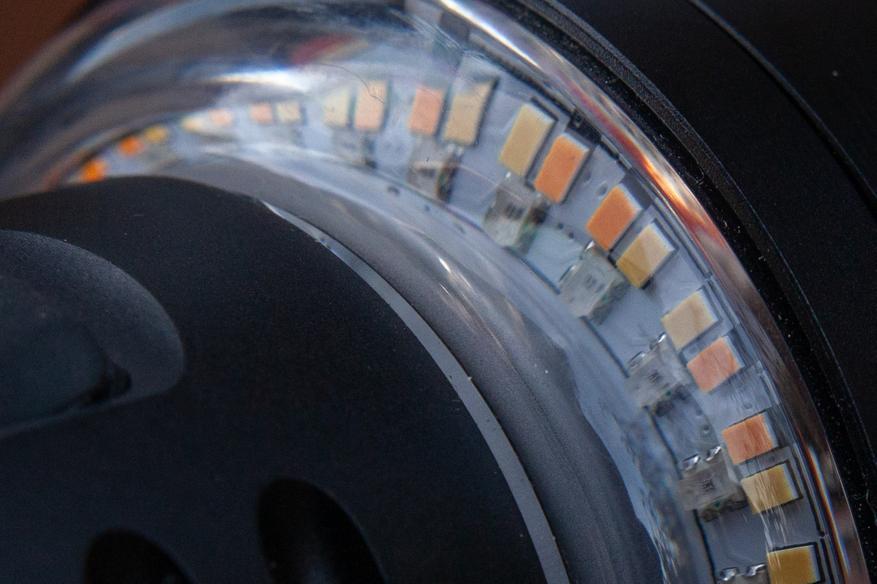 Если подняться глазами чуть выше, то увидим вторую после аккумулятора фишку фонарика — прозрачное кольцо со светодиодами для кемпингового света и RGB-цирка. Тут, напомню, имеем набор из 30+30 холодных и тёплых светодиодов CSP 1313 для кемпингового света + 30 CSP 1313 для RGB-света.