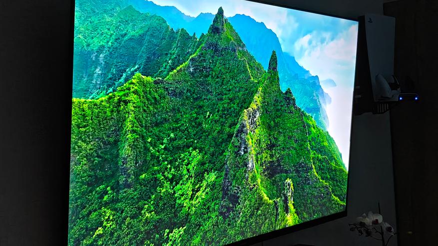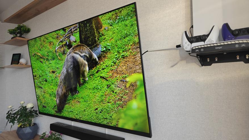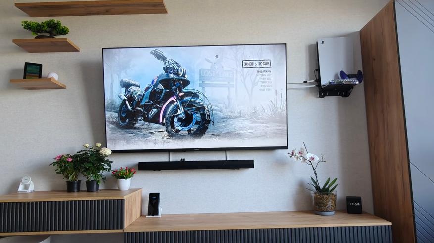 С лицевой стороны все пространство занимает огромный (по размерам моей гостиной) 60-дюймовый экран.
