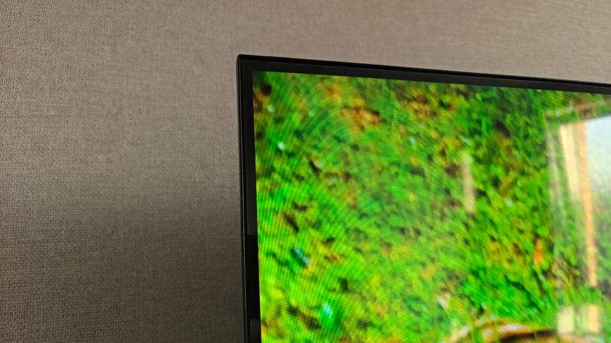 Дизайн телевизора безрамочный. Тут реально минимальные полосочки пластиковых рамок и еще миниатюрные черные полоски миллиметра 4 толщиной. Нижняя пластиковая полоска потолще, на ней размещен логотип производителя.