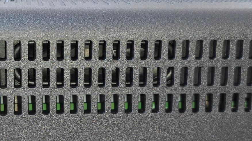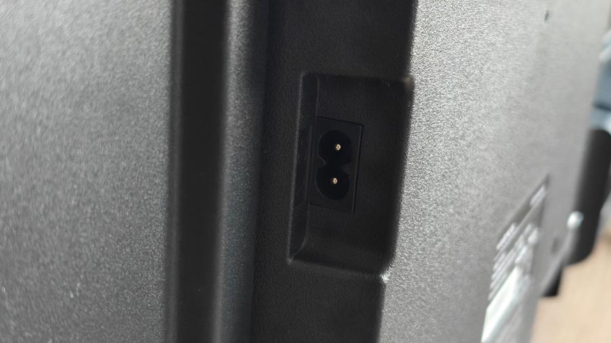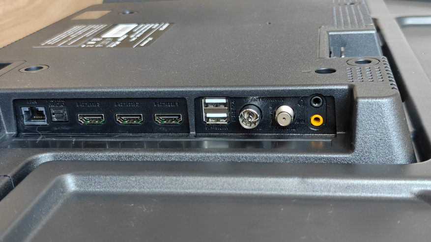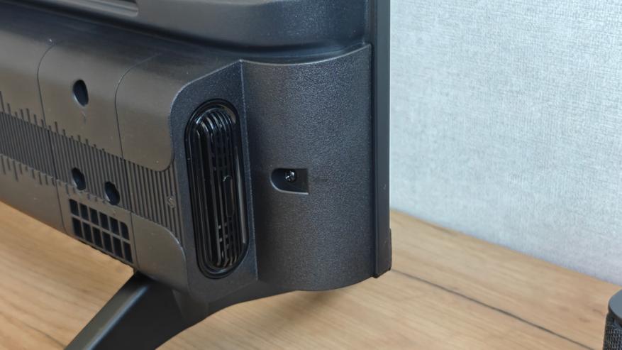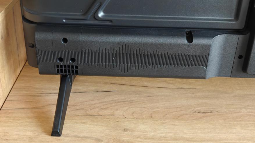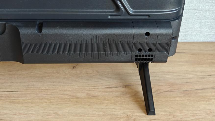 Снизу традиционное утолщение, где прячется основная плата телевизора. По сторонам нижней части также пластиковые корпуса динамиков и пассивных фазоинверторов. Решетки фазоинверторов смотрят в стороны направо и налево, динамики смотрят вниз, прикрытые решетками.