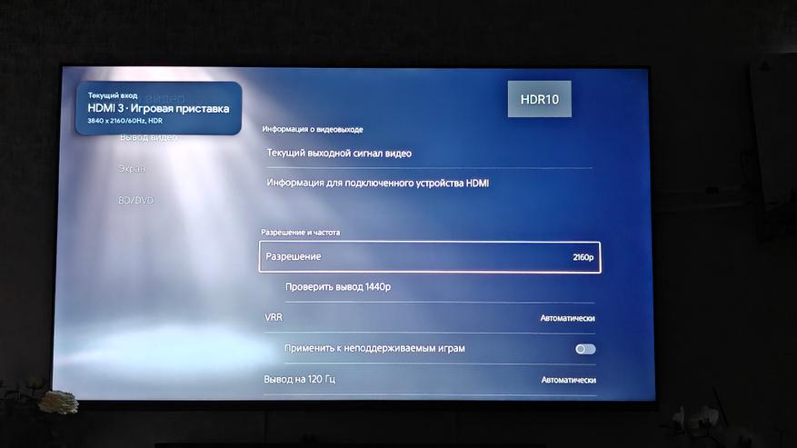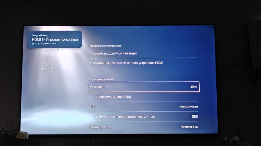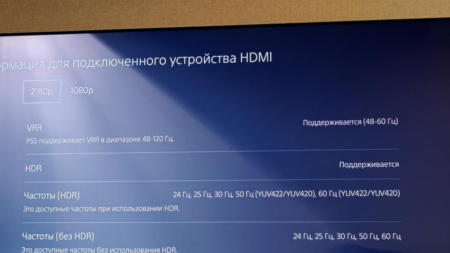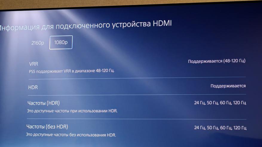 Проверку возможностей по воспроизведению игрового контента проведем, подключив PS5. Она умеет тестировать подключенные устройства на момент различной частоты, поддержки современных стандартов технологии HDR и VRR. Этот телевизор поддерживает разрешение до 2160р при частоте 60 Гц и 1080р при частоте 120 Гц, так что мы можем получить более плавную картинку в играх, которые это поддерживают. Поддержка HDR 10 подтверждается также.