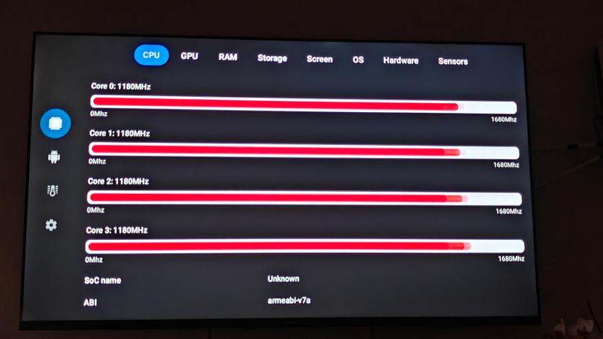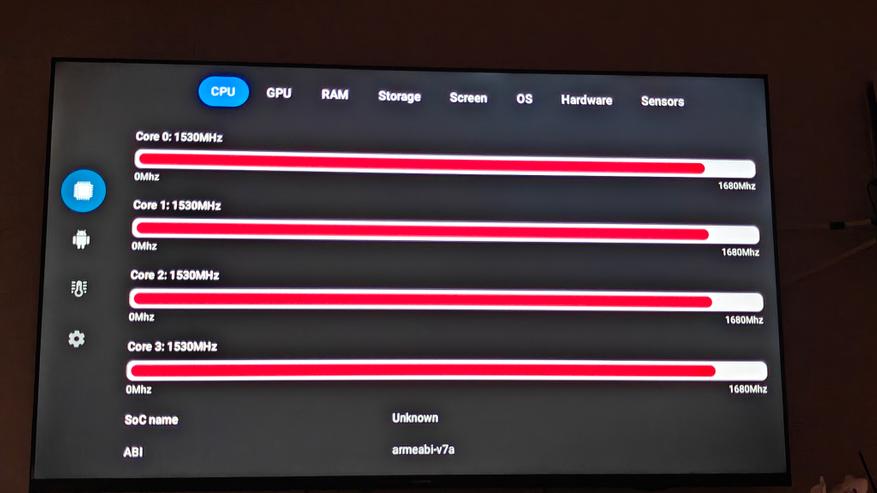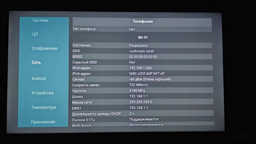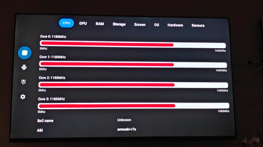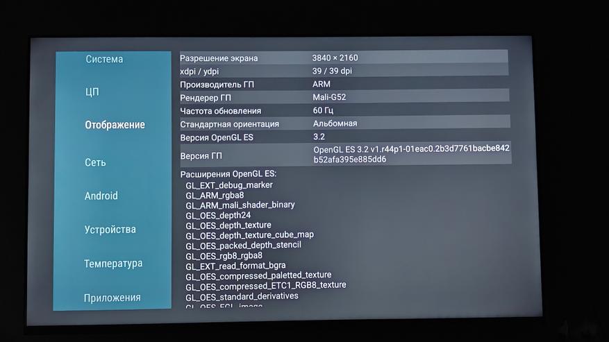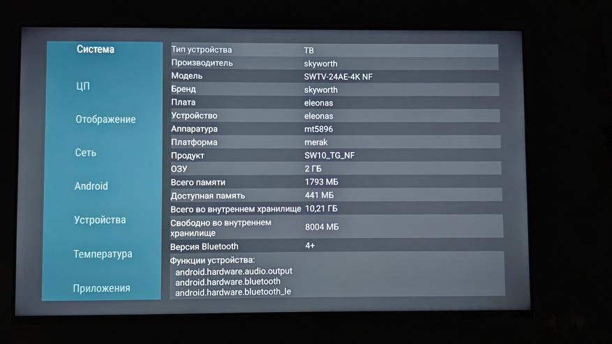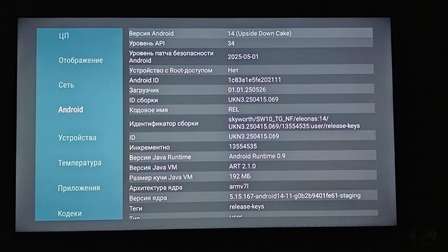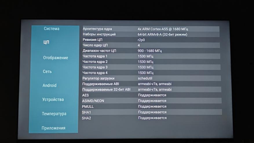Телевизор работает на Android 14. Управляется система процессором ARM Cortex-A55, постоянной памяти — 16 ГБ, оперативной — 2 ГБ. Система хорошо оптимизирована и даже при условии установки сторонних приложений работает довольно стабильно. Все заявленное железо, включая матрицу с разрешением до 4К 60 Гц, подтверждается бенчмарками AIDA 64 и CPU-Z.