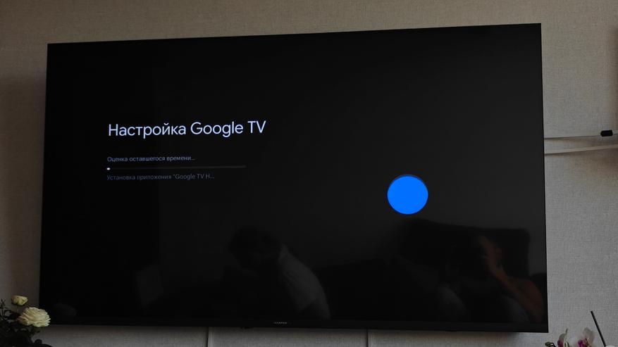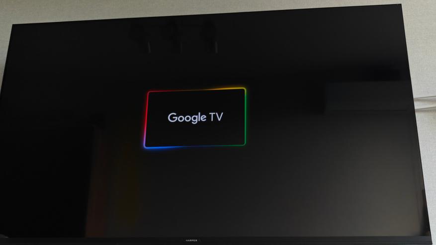 Включаем телевизор в розетку. Передний световой индикатор сообщает нам о спящем режиме телевизора красным светом. Кстати ночью такой индикатор не напрягает, не яркий. По кнопке на пульте включается основная заставка телевизора тут логотип производителя и заставка Google TV.