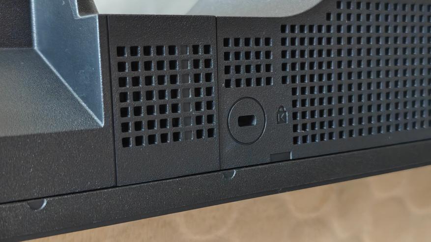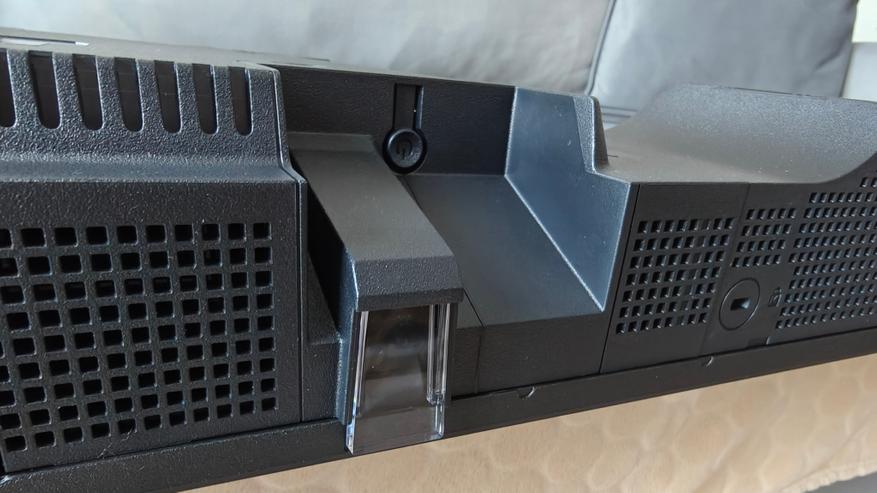 По центру снизу есть углубление в корпусе, в котором расположен светоотражатель вывода сигналов фотоприемника на лицевую сторону и красного светодиода статуса питания. Снизу даже есть замок кенсингтона, мало ли у вас есть риск падения телевизора, можно будет его пристегнуть на коротенький тросик.