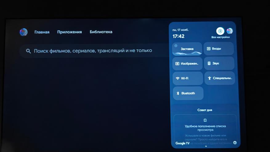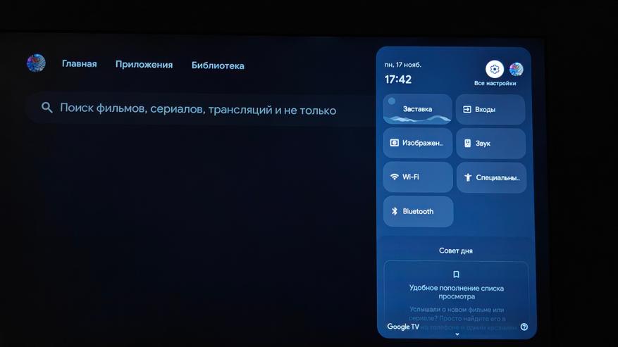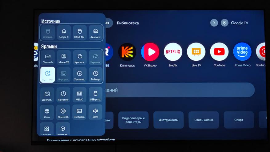 Особенность Гугл ТВ в том, что перед вами полная свобода использования возможностей андроид. Это и подписочные сервисы и сторонние установленные программы. Программы можно устанавливать любым удобным способом. передать с телефона как файл, скачать с флешки, обратиться к облачным хранилищам. Абсолютно полная свобода. По нажатию кнопки на пульте выбор источника выходит шторка быстрых инструментов, которая настраивается на ваш вкус. Там есть даже бесплатный вызов встроенного ПО с мировым IP-TV, в котором есть широкий выбор любых ТВ каналов мира, а также релакс зоны, чтобы просто насладиться красивой картинкой и звуком леса, океана, горящего камина, грозы.