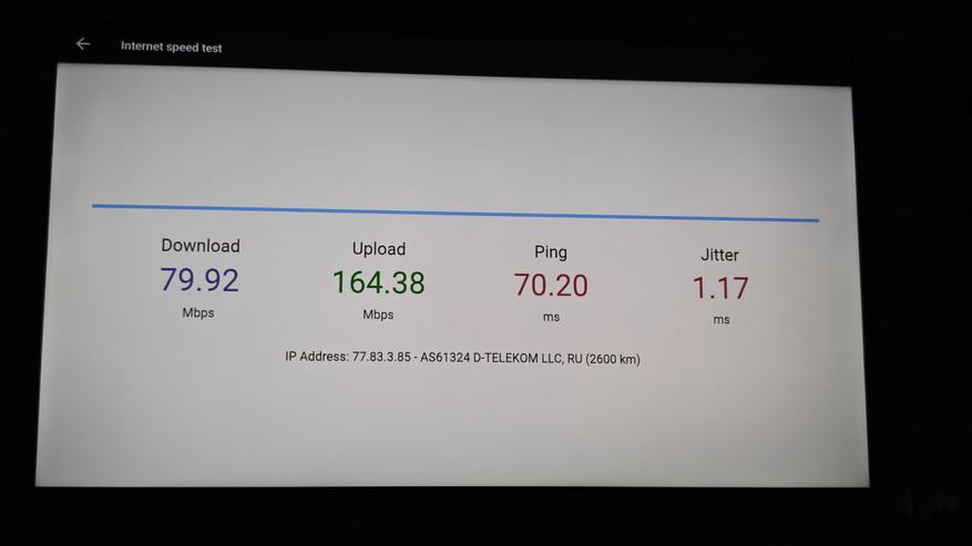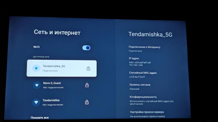 Этот телевизор подключается к Wi-Fi в диапазоне 5 ГГц и дает скорости интернета (телевизор расположен на расстоянии 15 метров от роутера, через две бетонные стены) позволяющие воспроизводить любой контент онлайн, вплоть до 4К. Матрица проходит классические тесты на передачу оттенков и градиентов. На темном фоне слегка видна засветка по центру экрана сверху (признак бюджетных телевизоров) но в обычной эксплуатации это не заметно и не мешает. На белом фоне затемнений нет.