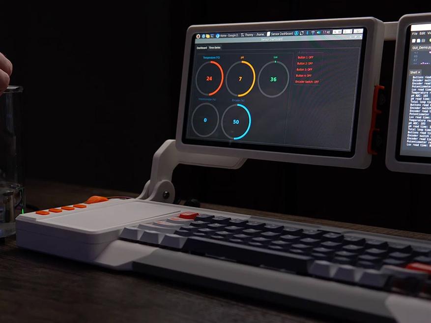 Под нижним дисплеем размещена компактная механическая клавиатура с линейным регулятором громкости, четырьмя программируемыми макроклавишами и поворотным энкодером со встроенной кнопкой. Внешний порт I2C и открытый разъем GPIO обеспечивают возможность подключения дополнительных датчиков или экранов.