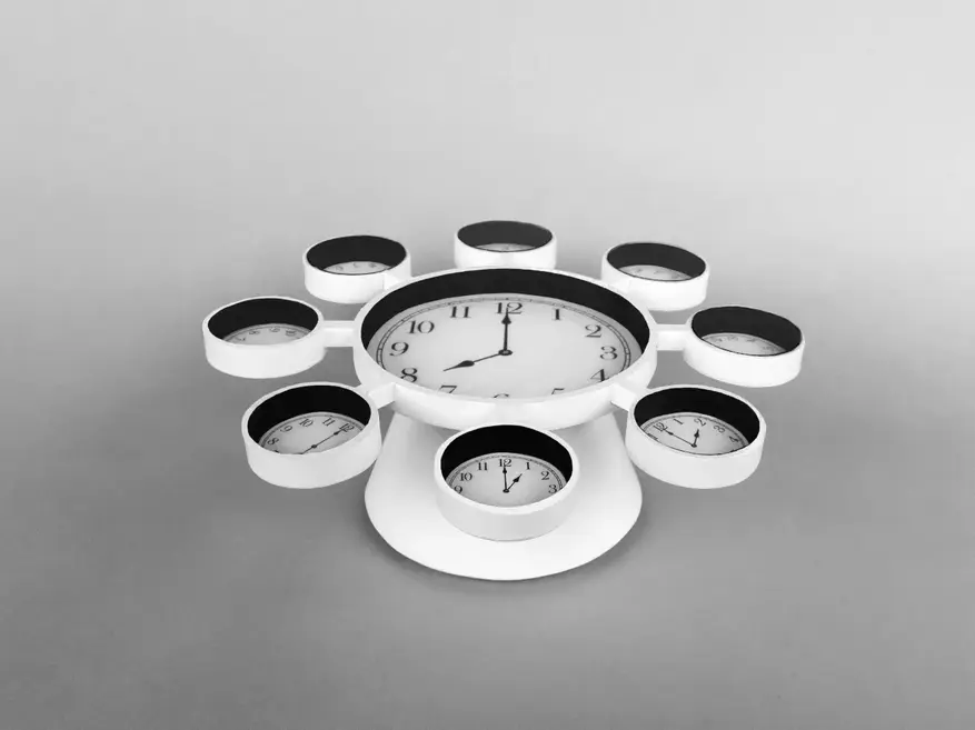 Все предметы выполнены в единой цветовой схеме: белые корпуса, чёрные циферблаты и прозрачные стеклянные столешницы. Серия предназначена для повседневного использования.