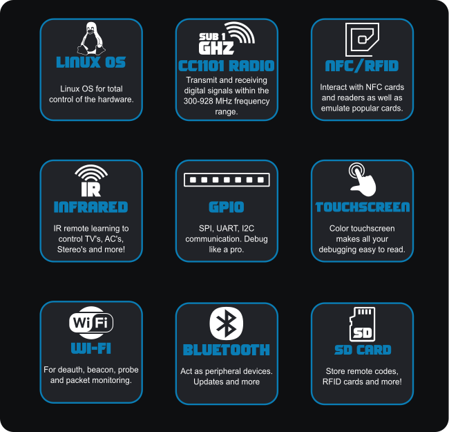 - Радиочастотный модуль (ВЧ Sub-1 ГГц), который дает возможность тестировать доступ к шлагбаумам, IoT-устройствам, перехватывать и эмулировать сигналы в диапазоне 300-928 МГц.