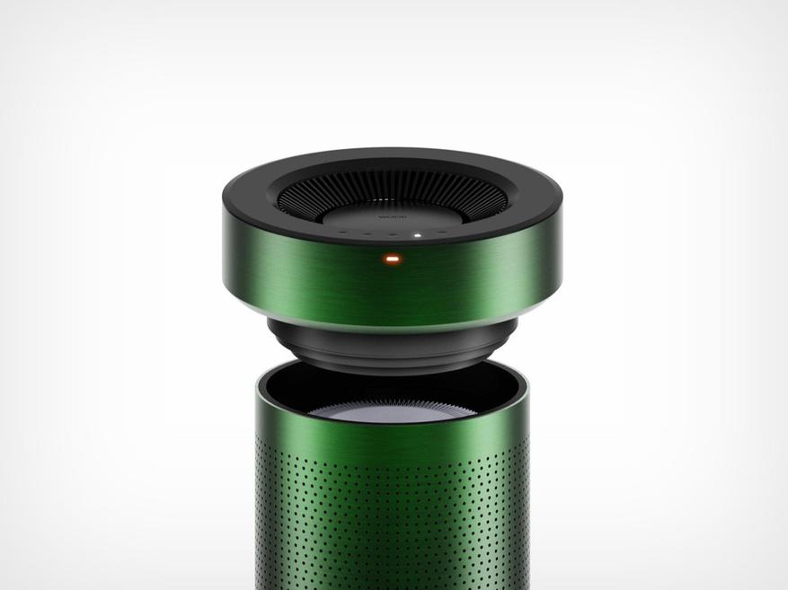 Очиститель имеет цилиндрический корпус с перфорированной поверхностью для забора воздуха. В верхней части расположена расширенная крышка с радиальными выпускными отверстиями и панелью управления. Перфорация распределена по всей поверхности корпуса для обеспечения максимального притока воздуха к встроенному HEPA-фильтру.