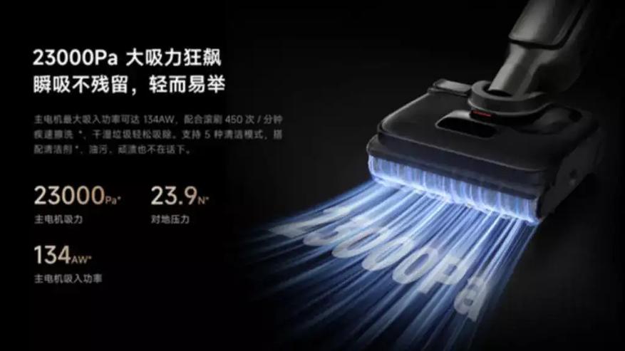 Мощность всасывания устройства составляет 23 000 Па при энергопотреблении 134 Вт. Роликовая щетка вращается со скоростью 450 оборотов в минуту. Встроены пять режимов работы, включая адаптацию мощности всасывания, режим для паркета с сушкой и режим для кухни.
