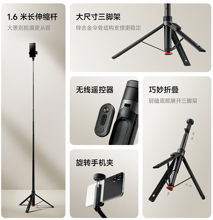 Судя по описанию, главной особенностью монопада-штатива является складной дизайн. Телескопический шест выполнен из алюминиевого сплава и имеет 10 секций, с возможностью выдвигаться до 1,6 метров.