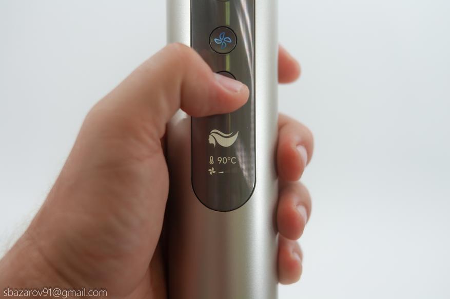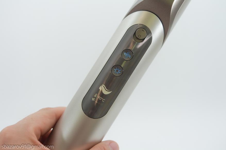 Управление феном вынесено в отдельный блок с переливающейся текстурой. На первый взгляд может показаться, что овальная область занимает сильно больше места, нежели нужно для блока кнопок. Однако все меняется, когда мы переводим тумблер в положение «Вкл».