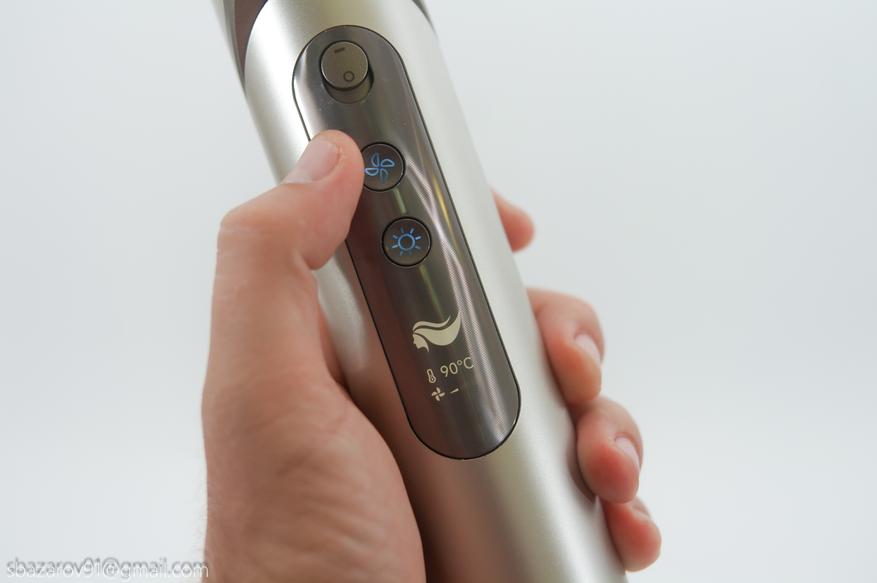 Основное неудобство со стайлерами заключается в банальной сушке, приходится гнуть руку, чтобы направить поток воздуха на себя. Поэтому большинство производителей комплектуют стайлеры дополнительной насадкой, тем самым увеличивая габариты устройства и вызывающую давление на руку. В случае Dazzle была разработана поворотная конструкция, решающая эту проблему иным способом. Теперь, если требуется сушка, достаточно повернуть верхнюю часть фена в сторону пользователя, и тогда Dazzle примет привычный вид классического фена.