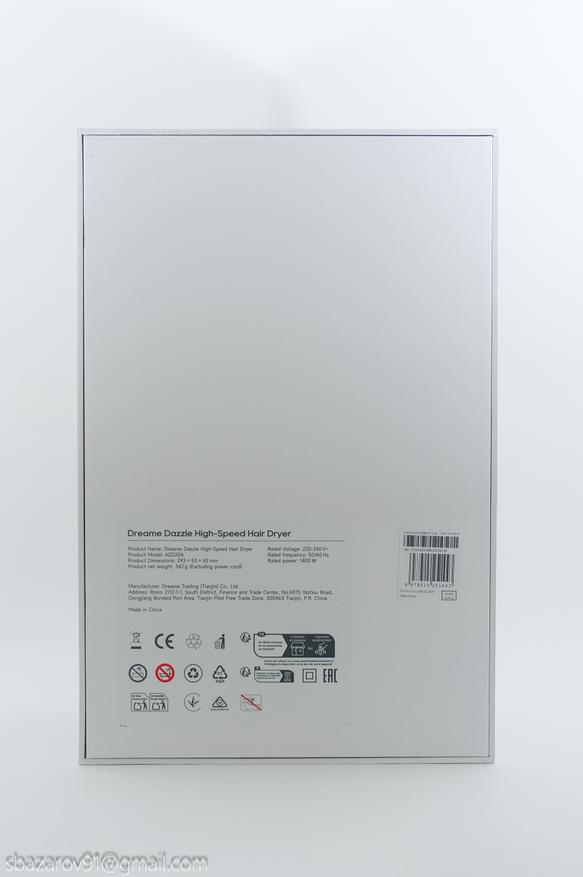 Если снять вкладыш, то перед нами обычная коммерческая упаковка в минималистичном стиле, где изображен внешний вид фена и его технические характеристики.