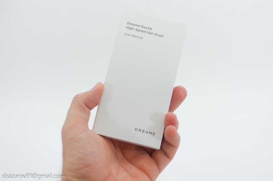 С точки зрения упаковки своего нового фена Dreame явно постарались. Базовая коробка имеет внешний вкладыш на магнитной застежке, дарить такой набор — одно удовольствие! В центре вкладыша заглавная буква бренда из которой выглядывает фен в сложенном состоянии.