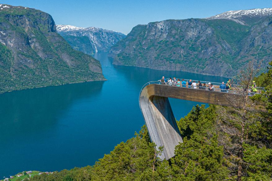 В норвежском фьорде Aurland на высоте 600 метров расположилась необычная смотровая площадка, напоминающая гигантский трамплин. Aurland Lookout выполнен из дерева и имеет изогнутую форму, будто продолжающую линию горного склона. Платформа заканчивается прозрачным стеклянным барьером, который почти незаметен, что усиливает ощущение высоты.