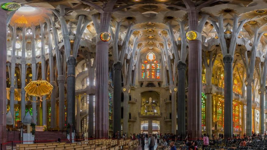 Внутри храма царит особая атмосфера. Внутреннее пространство наполнено светом, проникающим через цветные витражи. Колонны, напоминающие деревья, поддерживают своды, создавая впечатление, будто вы находитесь в зачарованном лесу.
