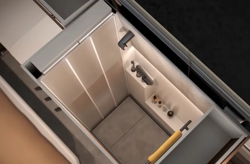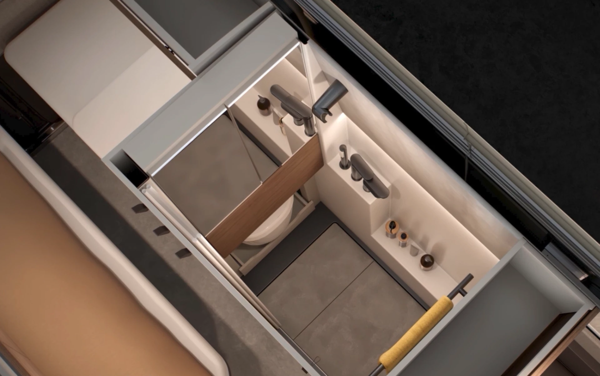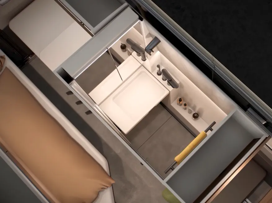 В ночной конфигурации образуются две односпальные кровати: одна размером 192x72 см, другая — 182x76 см. При этом туалет остается доступным для использования. Унитаз выдвигается из-за задней стенки, а раковина складывается в стену, когда не используется.