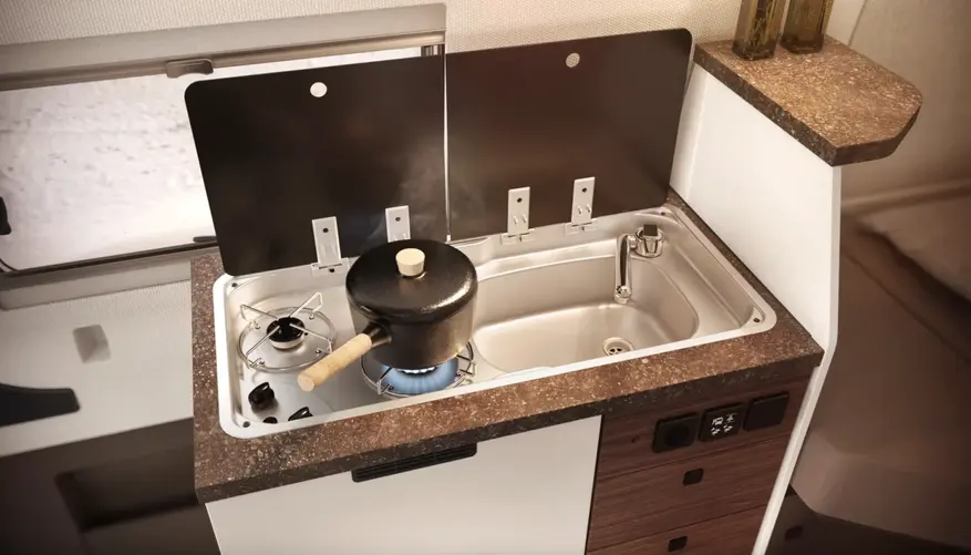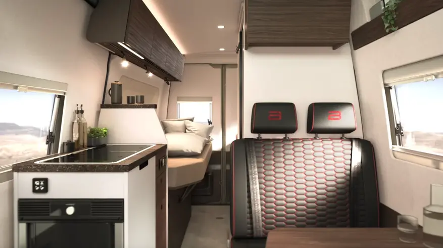 Стандартное оснащение включает кухню с двухконфорочной плитой, раковиной и холодильником на 69 л, складную обеденную зону, дизельную систему отопления и аккумулятор на 95 Ач. Среди опций — литиевая батарея на 150 Ач с солнечной панелью, зимний пакет и съемная платформа для фаркопа.