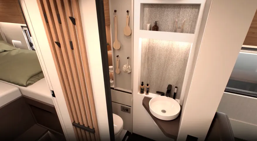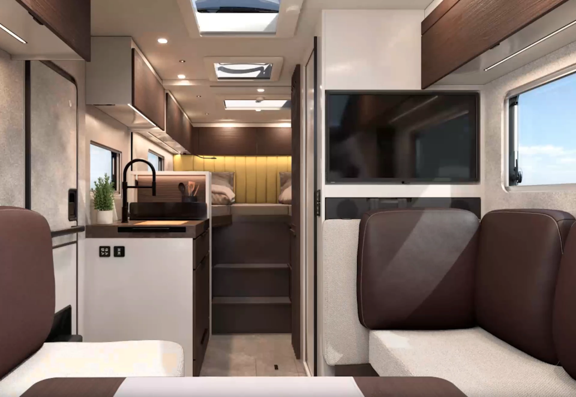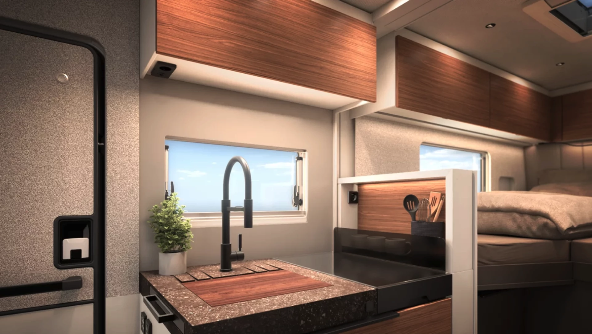 Базовая комплектация включает литиевую батарею емкостью 150 Ач, резервуар для пресной воды объемом 200 л и дизельный комбинированный отопитель. Покупателям доступно более 750 возможных комбинаций дизайна интерьера с различными вариантами обивки, отделки шкафов и мебели.