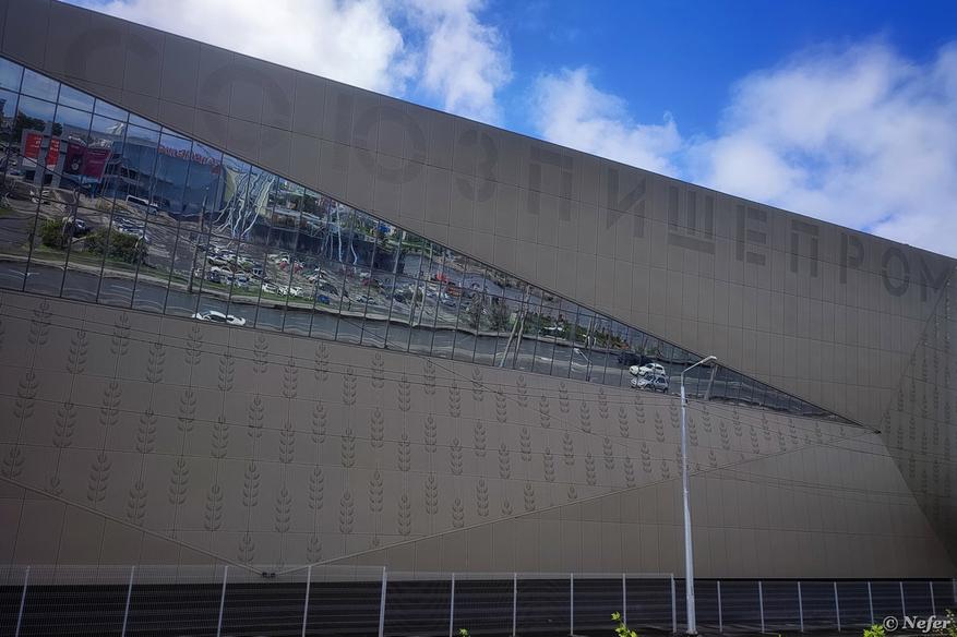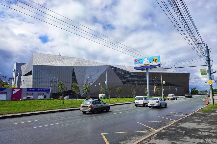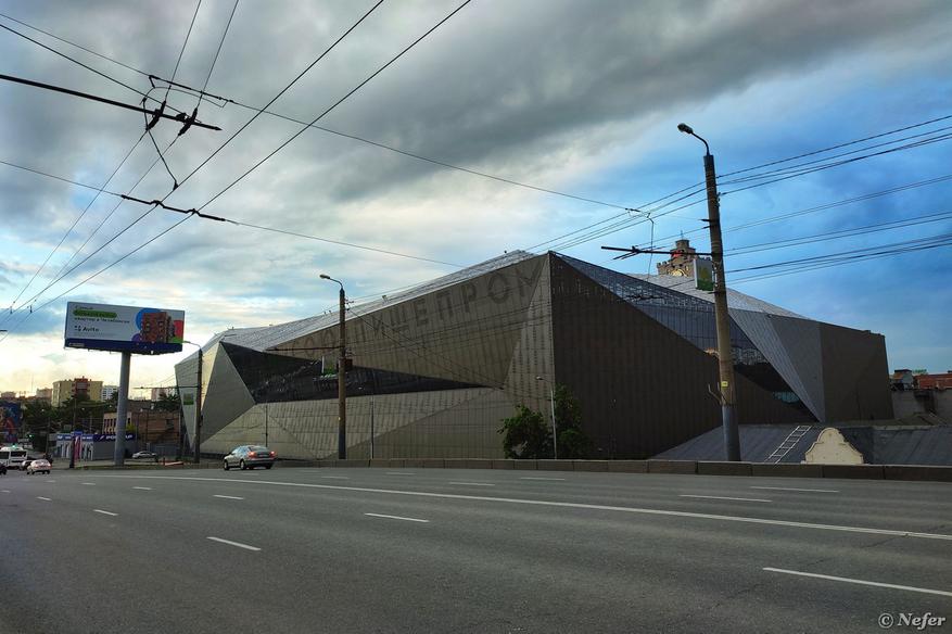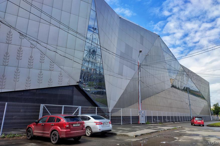 Таким я увидела здание впервые. На другом берегу реки, странной формы, мрачное, настоящий киберпанк. Я не могла предположить, что это такое… Торговый центр? Может не торговый, а выставочный, что-нибудь типа Челябинск Экспо? На карте объект не отмечен, территория окрашена серым цветом, обычно так обозначают промзоны. Непонятное манит, у меня аж засвербило. Мне просто необходимо было выяснить, что это такое во что бы то ни стало!