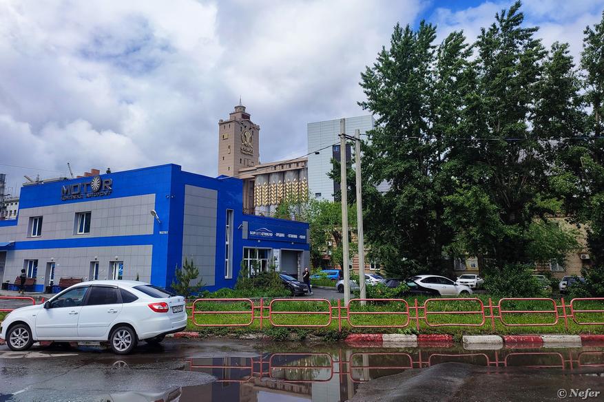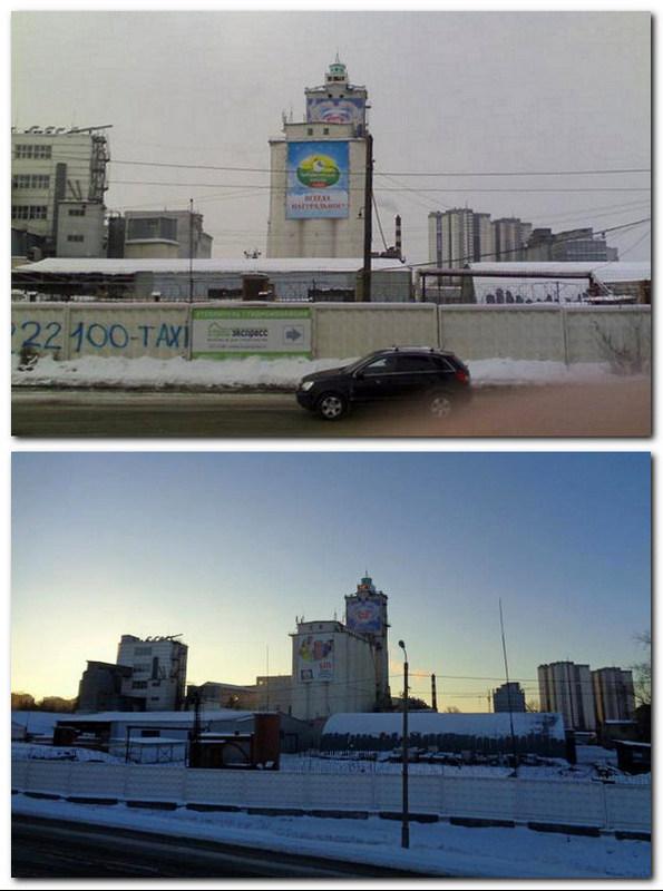 Объект не давал мне покоя. На следующий день я снова отправилась к нему. Там еще есть башня с золотыми колосьями, которая тоже заслуживает внимания. Это силосный корпус элеватора. Но, увы, рассмотреть ее с уровня земли невозможно. С другой стороны улицы далековато, а от проходной мешают деревья. Просунула смартфон через прутья ограждения, сделала фото, как могла.