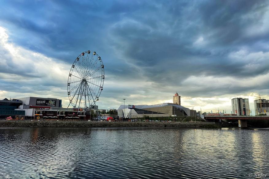 Ух, какой объект я нашла в Челябинске. Футуристическое здание стоит на берегу реки Миасс. Еще погода была соответствующая, предгрозовые тучи добавили драматичности. Несмотря на угрозу дождя, я догуляла до него, чтобы рассмотреть поближе и узнать, что же это такое.