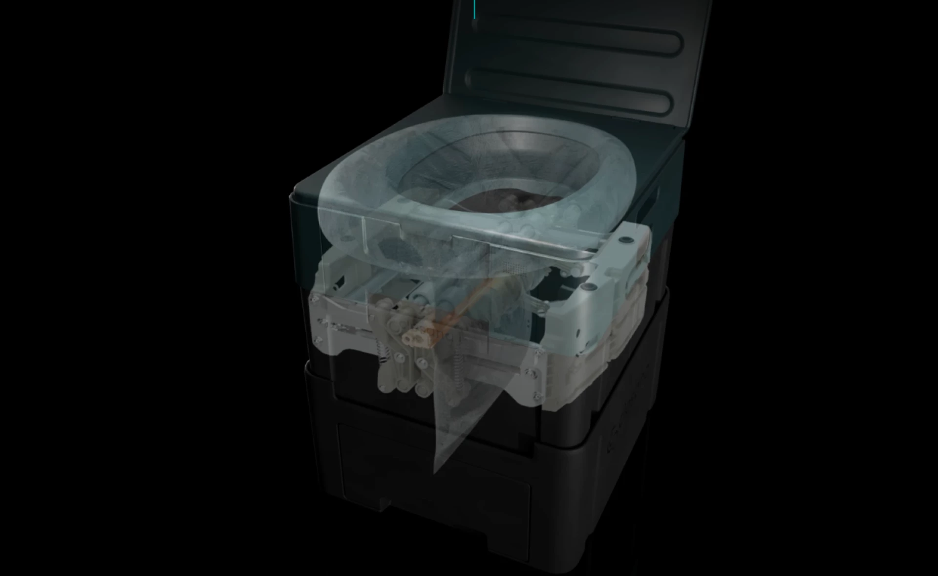 В туалете применяется система сухого смыва с термоэлектрической запайкой. Дно чаши покрыто специальной пленкой, которая собирает отходы. После использования пользователь нажимает кнопку, активирующую термоэлектрическую систему. Она запаивает пленку в герметичный пакет и разрезает его. Упакованные отходы попадают в нижний отсек с выдвижным лотком для извлечения и утилизации.