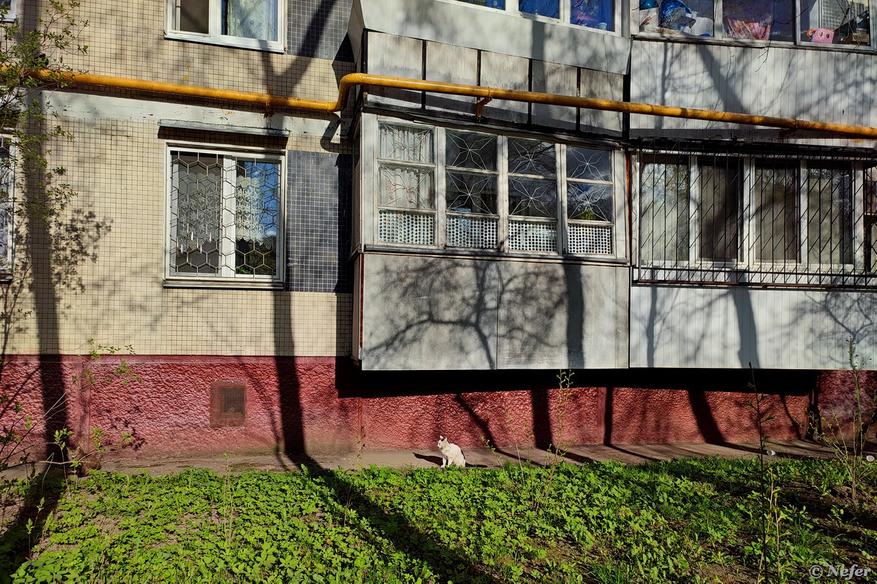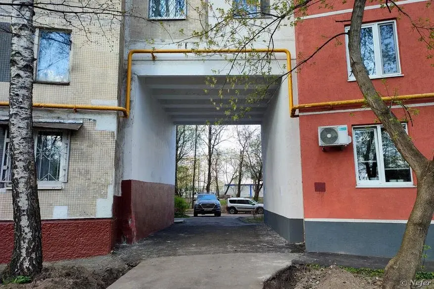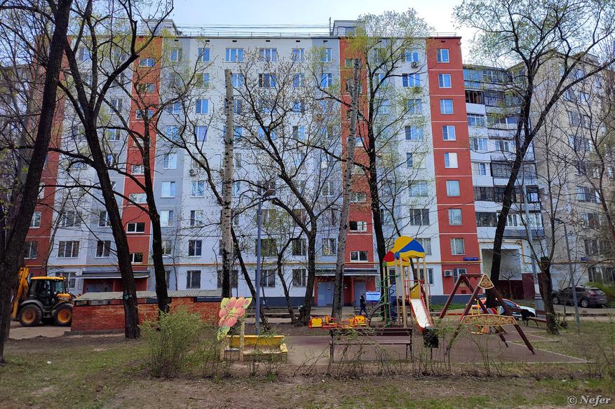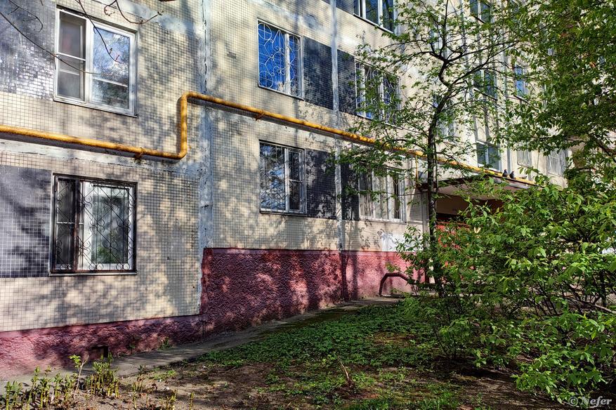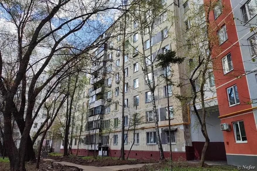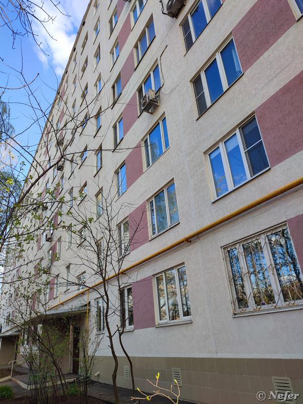 Дом построен в 1972 году и находится недалеко от МКАД. В то время это была тьма-таракань. Но все же Москва. На заглавной картинке и на фото ниже видно, что части дома отличаются друг от друга, слева — явно после ремонта, справа — покоцанность советских времен. Как-то странно.