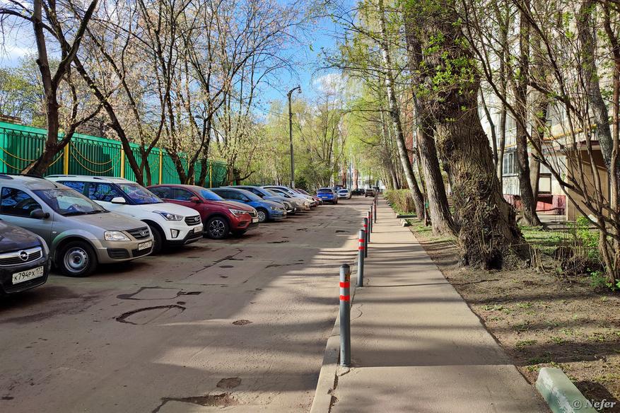 Во дворе припаркованы автомобили. За зеленым ограждением детский сад, чуть дальше еще один.