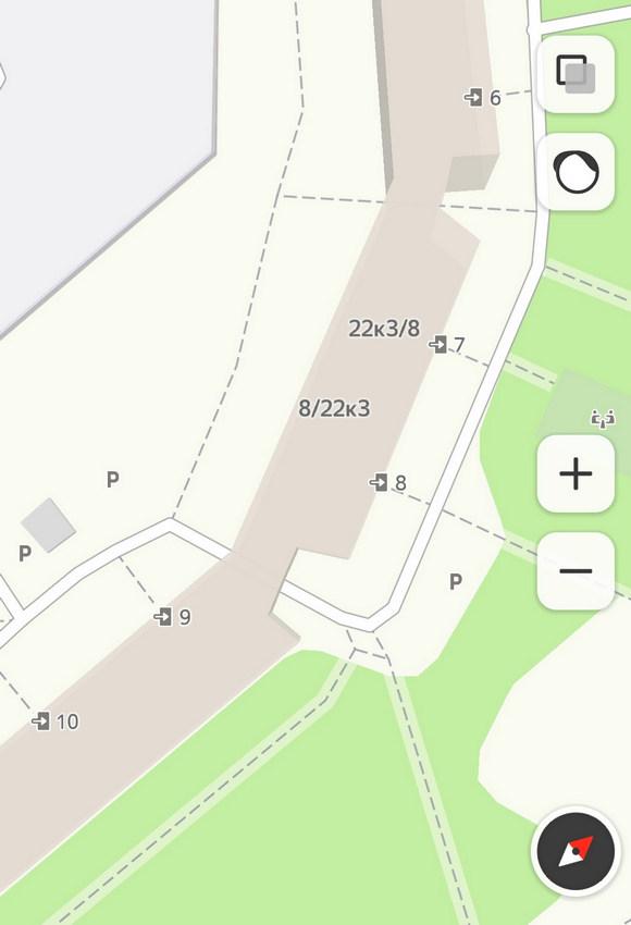 Дом имеет изогнутую форму и представляет собой дугу. Вот фрагмент карты. В нем кроется ответ на вопрос, почему часть дома отремонтирована, а соседняя нет. Это не один дом, это четыре отдельных корпуса. Первые три — серия II-49/Ю, последний четвертый, самый длинный — серия II-49/М. М — дома для меридиональной ориентации, Ю — для широтной.