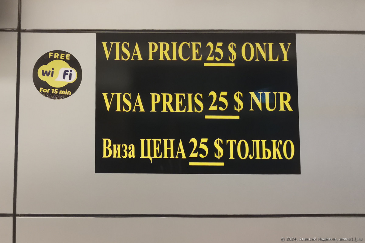 Следующая табличка с корявым текстом «Виза цена 25$ только» наклеена на стену не просто так: прилетающие туристы сразу попадают «в лапы» турагентов, пытающихся продать эту визу туристам за $27-30. Конечно у них покупать её не нужно.